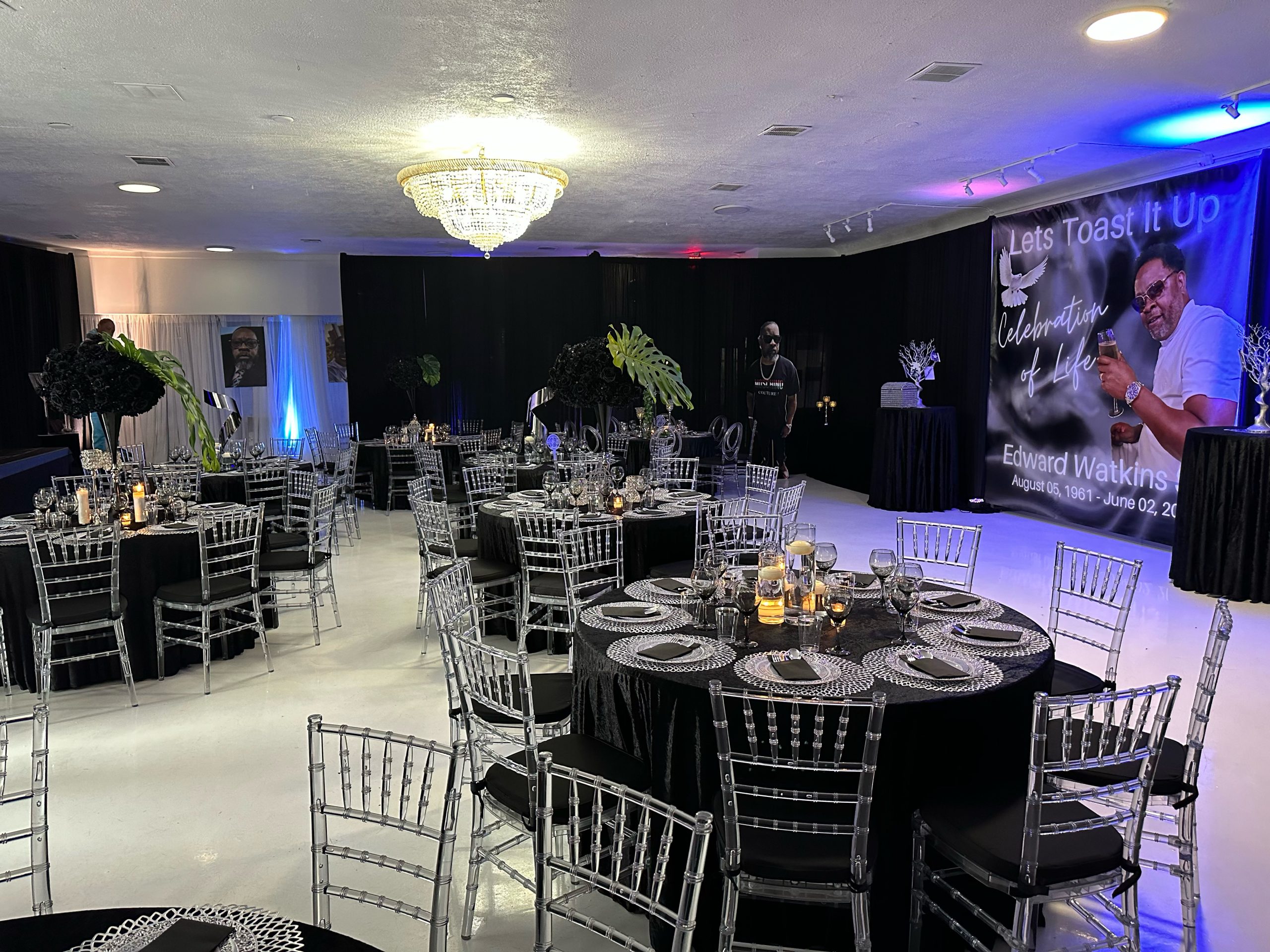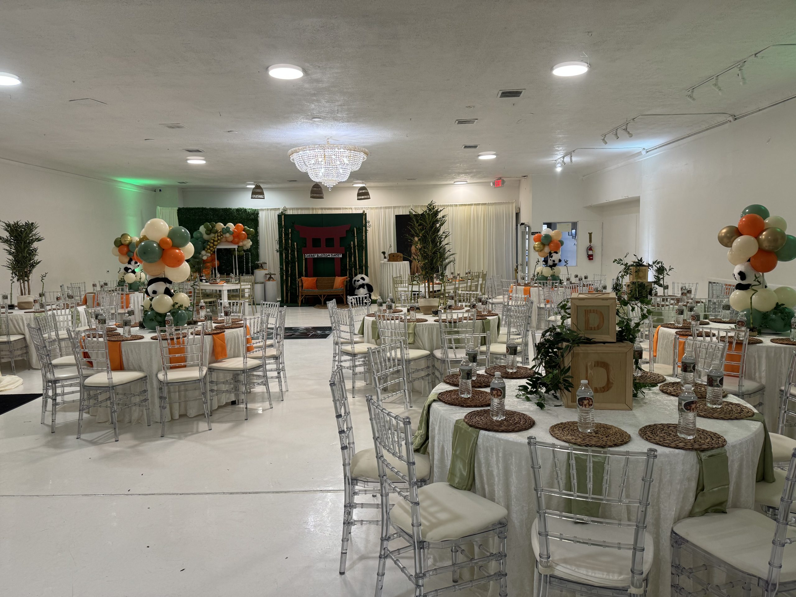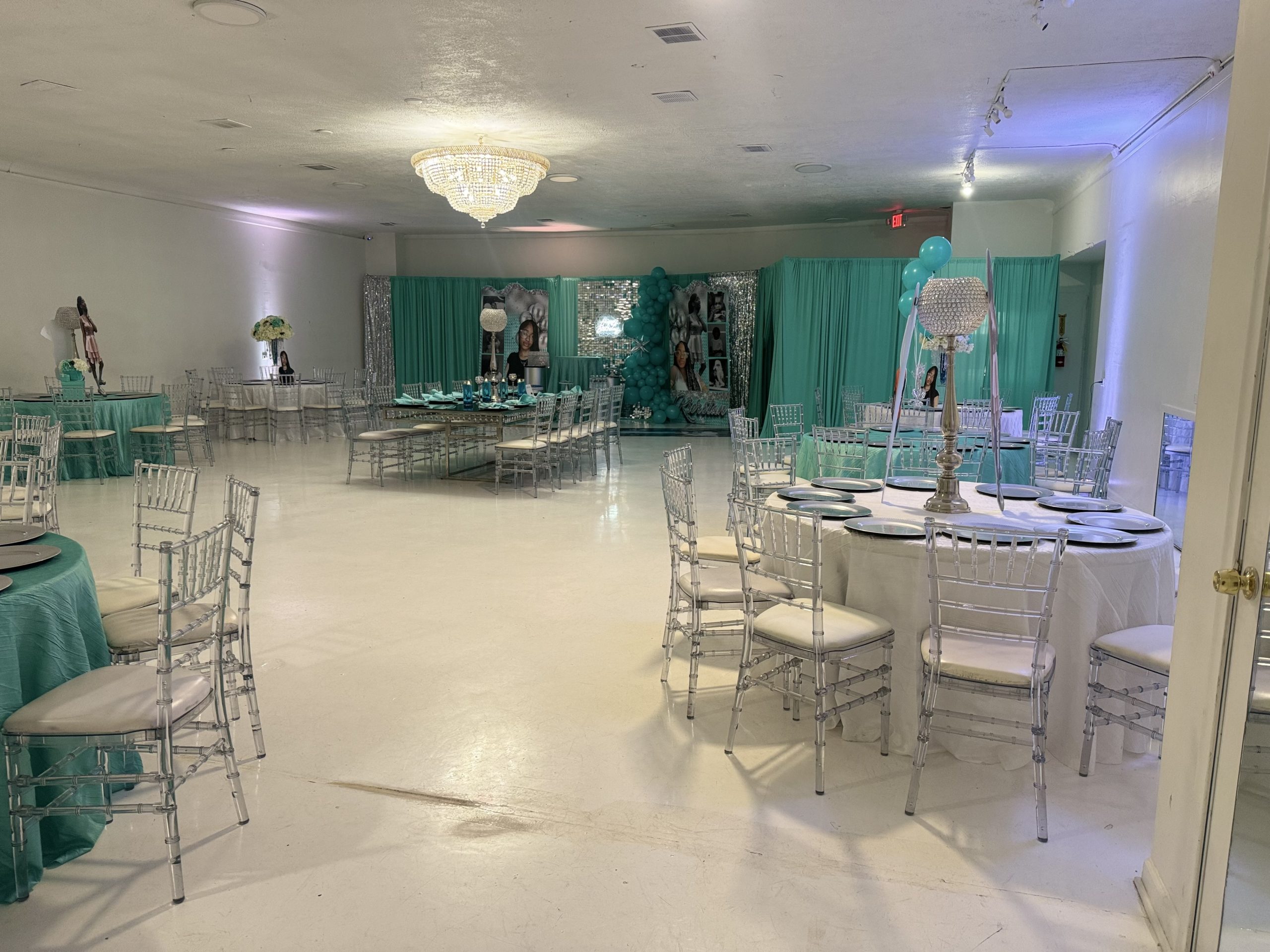 Welcome to 42nd Street Event Venue. This spacious venue can be transformed to fit various event set-ups ranging from business conferences to banquet style seating. This room can accommodate a large array of layouts. Emerge in our All white Blank Canvas Space equipped with multiple designer chair options, ranging from 100 clear chivari to 100 gold circle back chairs. Enjoy our gold dramatic tiered chandelier, dimmable lighting, ample parking, two handicap accessible restrooms, and kitchenette with food warmer for up to 8 pans commercial refrigerator and ice maker and two lots for parking. Our windows are covered with 40ft white sheer draping with optimal up lighting. This 3000qft open space is the perfect venue to celebrate life’s greatest moments.