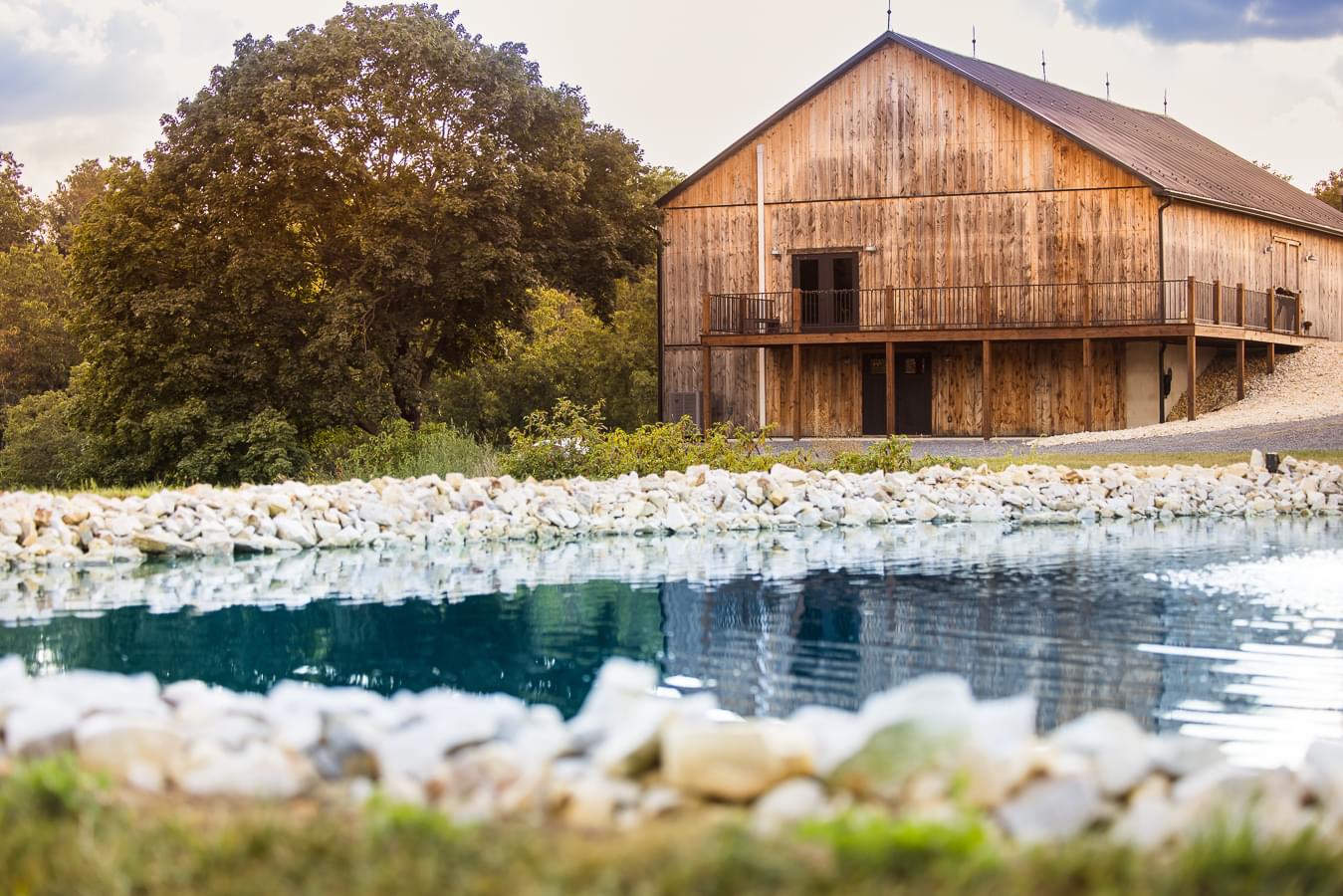 - Special Features: Multiple indoor and outdoor ceremony and reception sites, picturesque mountain and forest backdrop, charming rustic barn, pavilion by the pond, waterfall and pond, twinkle lights in the barn, stunning sunset views.