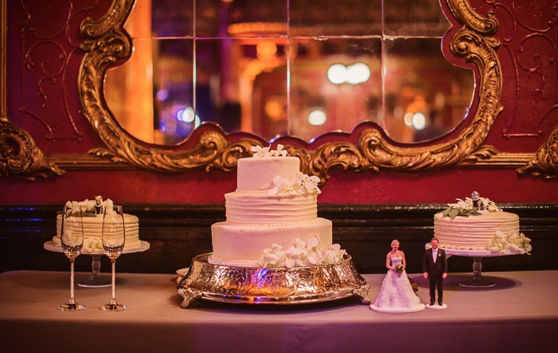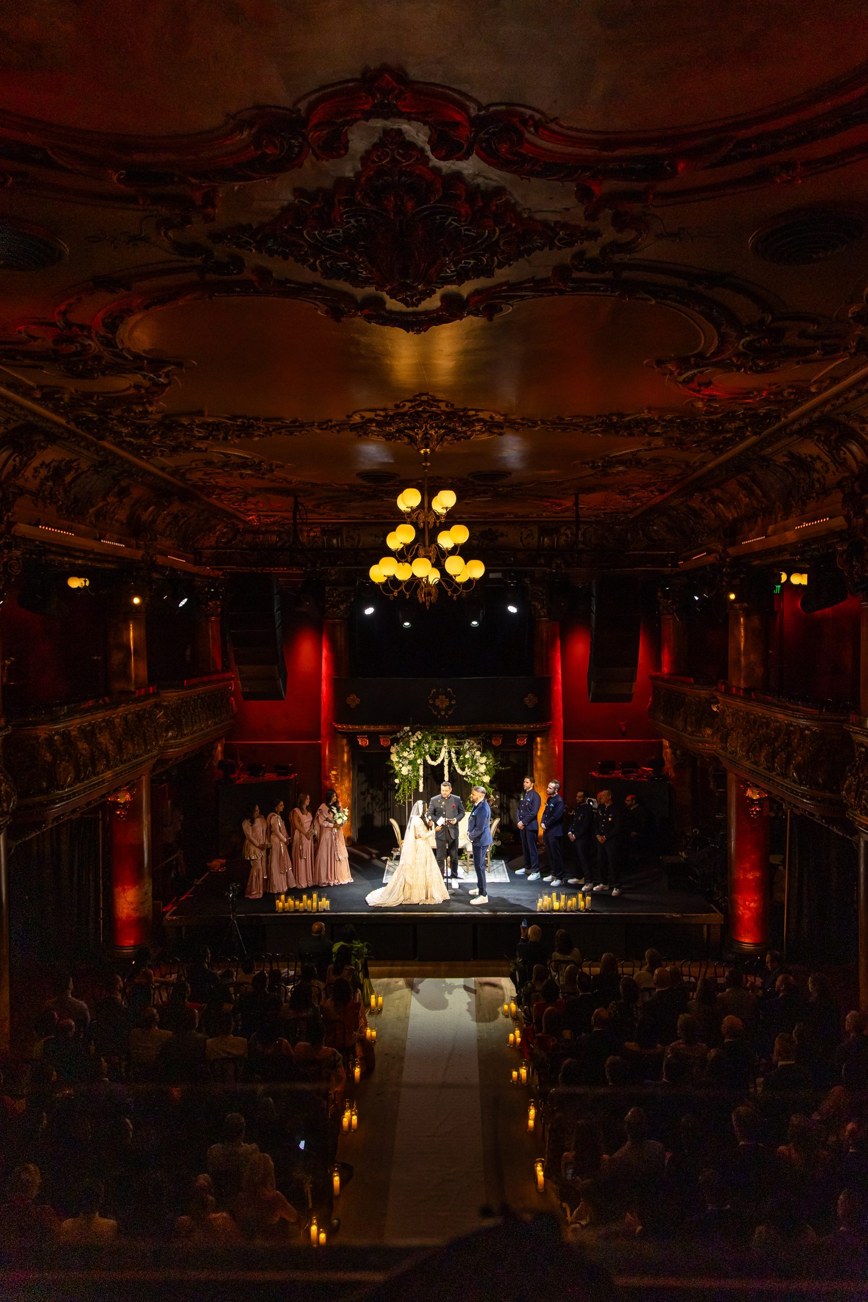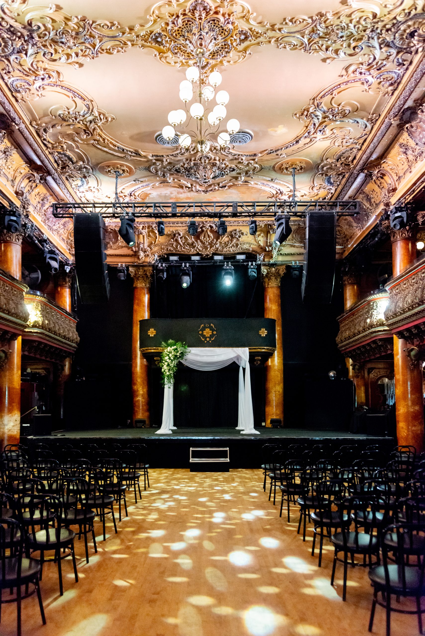 Couples getting married here use the stage for the ceremony, with their “audience” seated in chairs on the dance floor. Once the knot has been tied, the rows of chairs are removed and the Hall is ready for the next phase of the celebration. Tables have been set up for dining all around, and even on the balconies if you like. With a band or a DJ making music on the stage and your guests dancing in the center of the room, the festivities can carry on into the night.